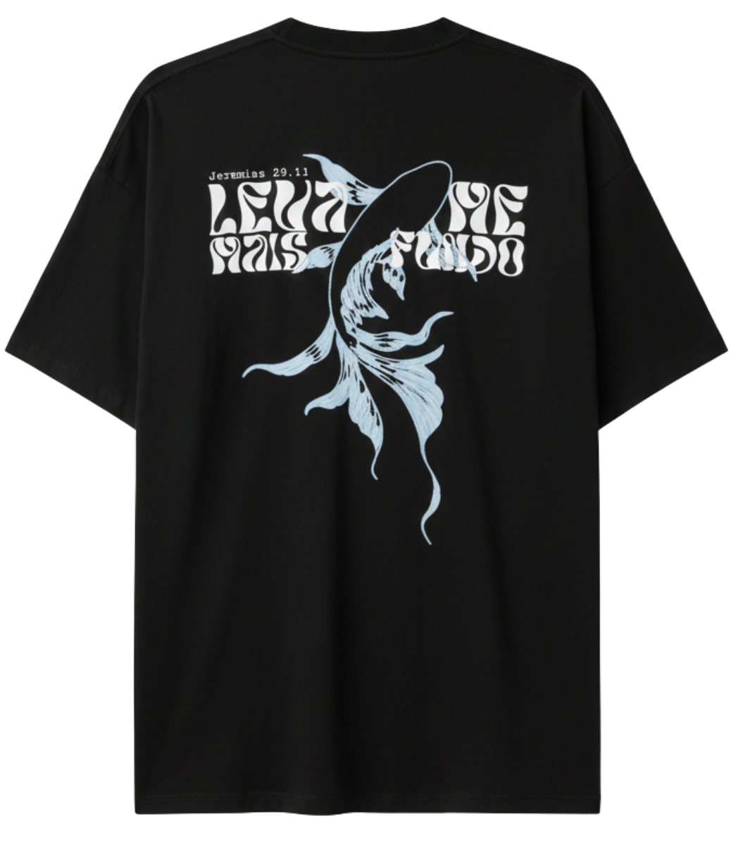 A camiseta “Leva-me Mais Fundo” agora ganha uma nova variação com desenho de um peixe, mantendo a profundidade espiritual da arte e o visual marcante.